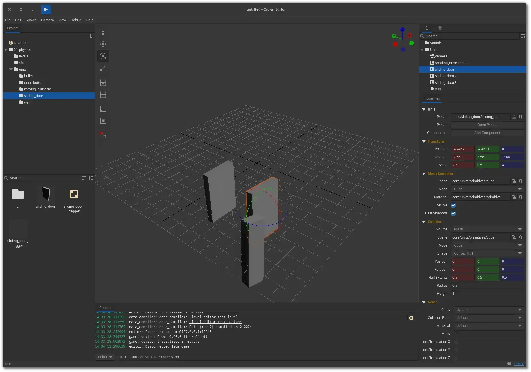 🕶️ A view of its user interface (v. 0.60, on my Linux PC) after starting a project (“physics” provided with the UI). The UI is fairly standard: the scene rendering in the center, a console at the bottom, various windows on each side (project tree and properties), the project launch button at the top, and the menus.