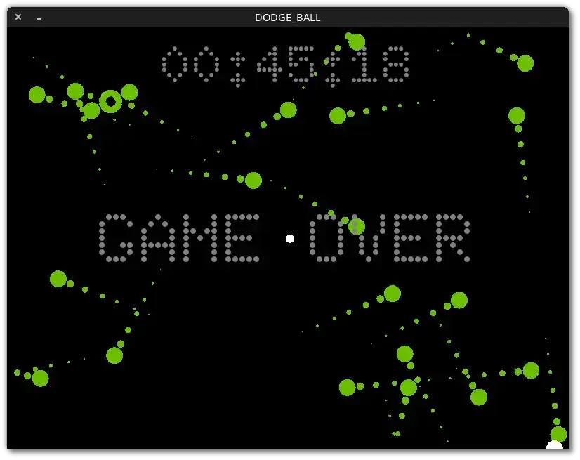 🕶️ A view of its interface (v.1.0.0, on my Linux PC) at the end of the game: my ball is the white ball at the bottom right of the screen where I ended up retreating before being hit by a green ball (end of game) after 45 seconds of play. The score is the time (displayed at the top of the screen) that elapsed before being hit by one of the twenty or so balls (there can be many more) that were bouncing around everywhere.