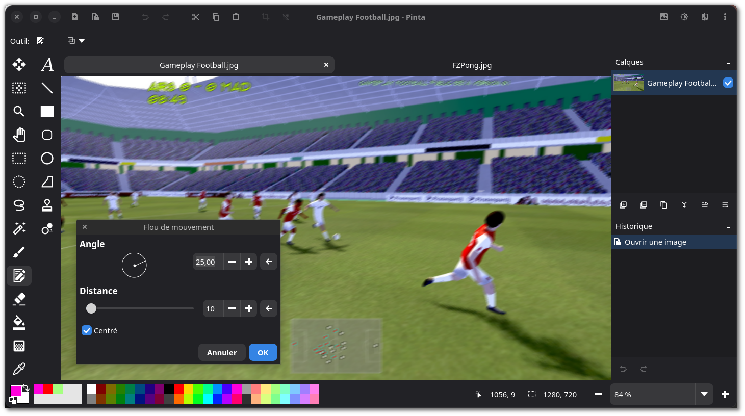 🕶️ A view of its user interface (v. 3.0.3, dark theme, on my Linux PC, in French) with several tabs open showing different screenshots of Linux games. The active tab is open on a screenshot of the "Gameplay Football" game. I chose this image because it allows me to illustrate the use of the “Motion Blur” filter and because I'm not good enough at drawing to show my work :). Nevertheless, I tested this tool and found it to be both simple and powerful. Excellent.