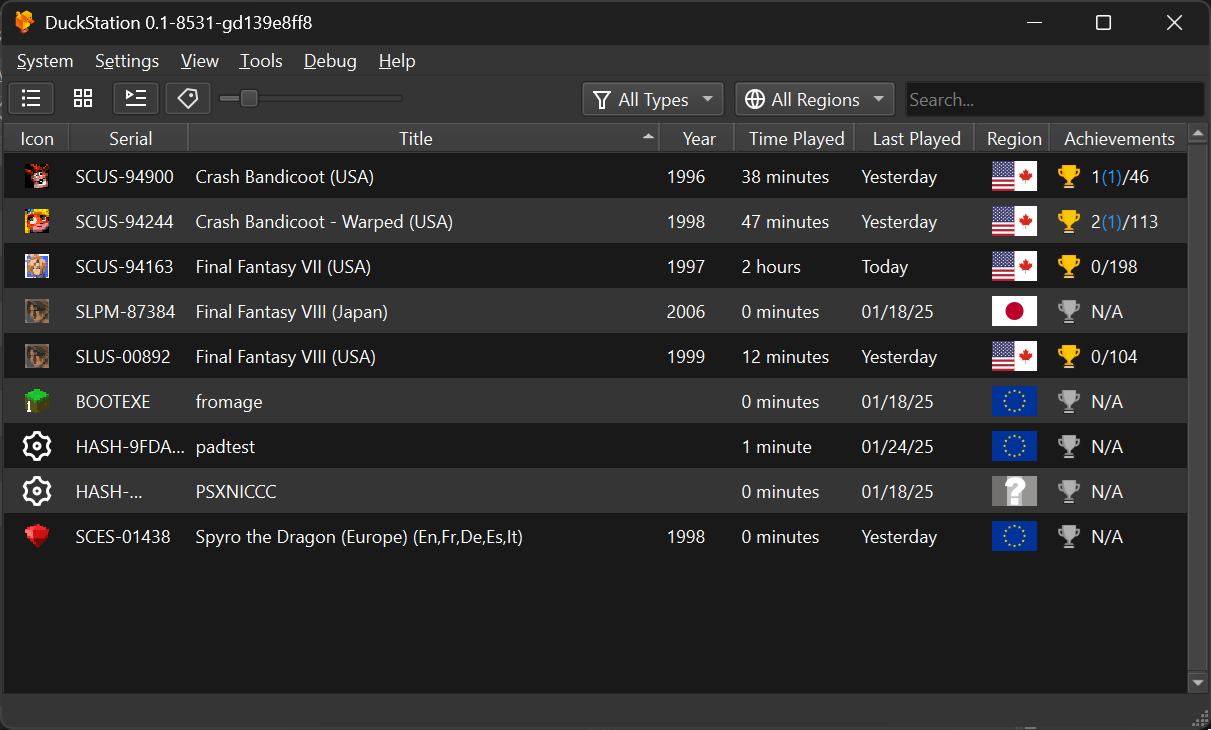 🕶️ A (temporary) screenshot of the Duckstation v.0.1 Qt interface, on a dark theme, showing a list of games in list view (with icon, name, year, game time, game date, region, and achievements), and its menus at the top.