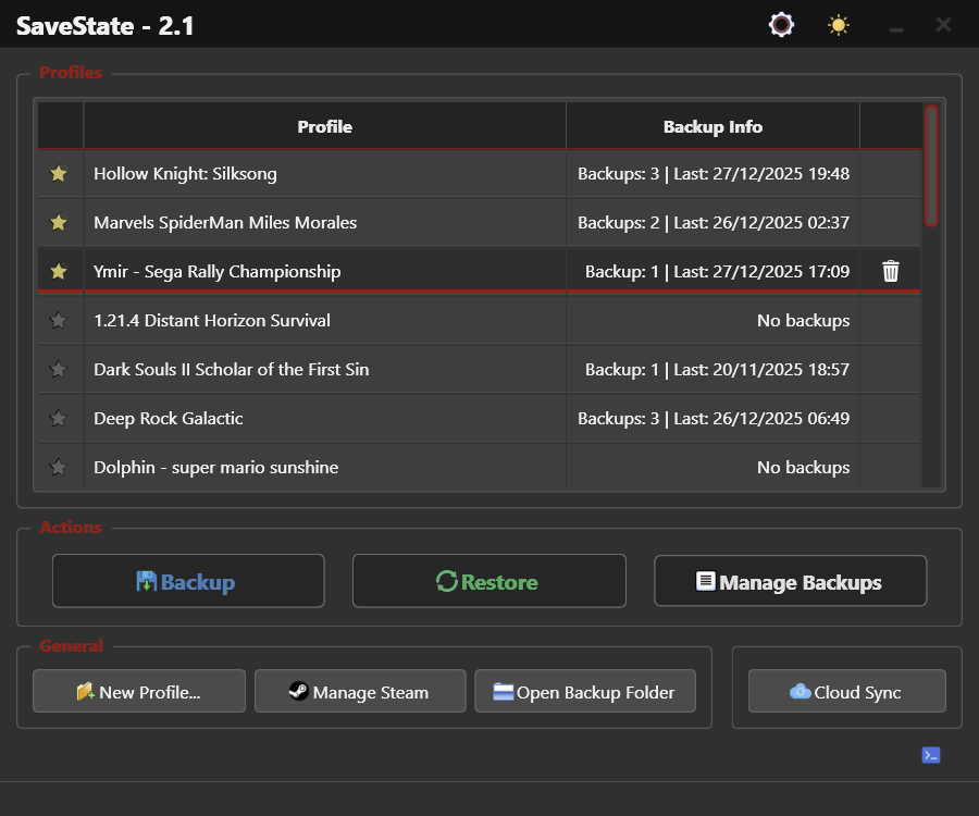 🕶️ A view of its user interface (v.2.1, taken from the website) with a list of game saves. It illustrates both the support for the Ymir emulator (with a game from this emulator listed in the saves to be deleted via an icon on the line that you just need to click) and the ability to delete profiles directly from this list. Several buttons at the bottom of the interface (including “Backup,” “Restore,” “Manage Backups,” “New Profile...,” “Manage Steam,” “Open Backup Folder,” and “Cloud Sync”) allow users to perform various actions.