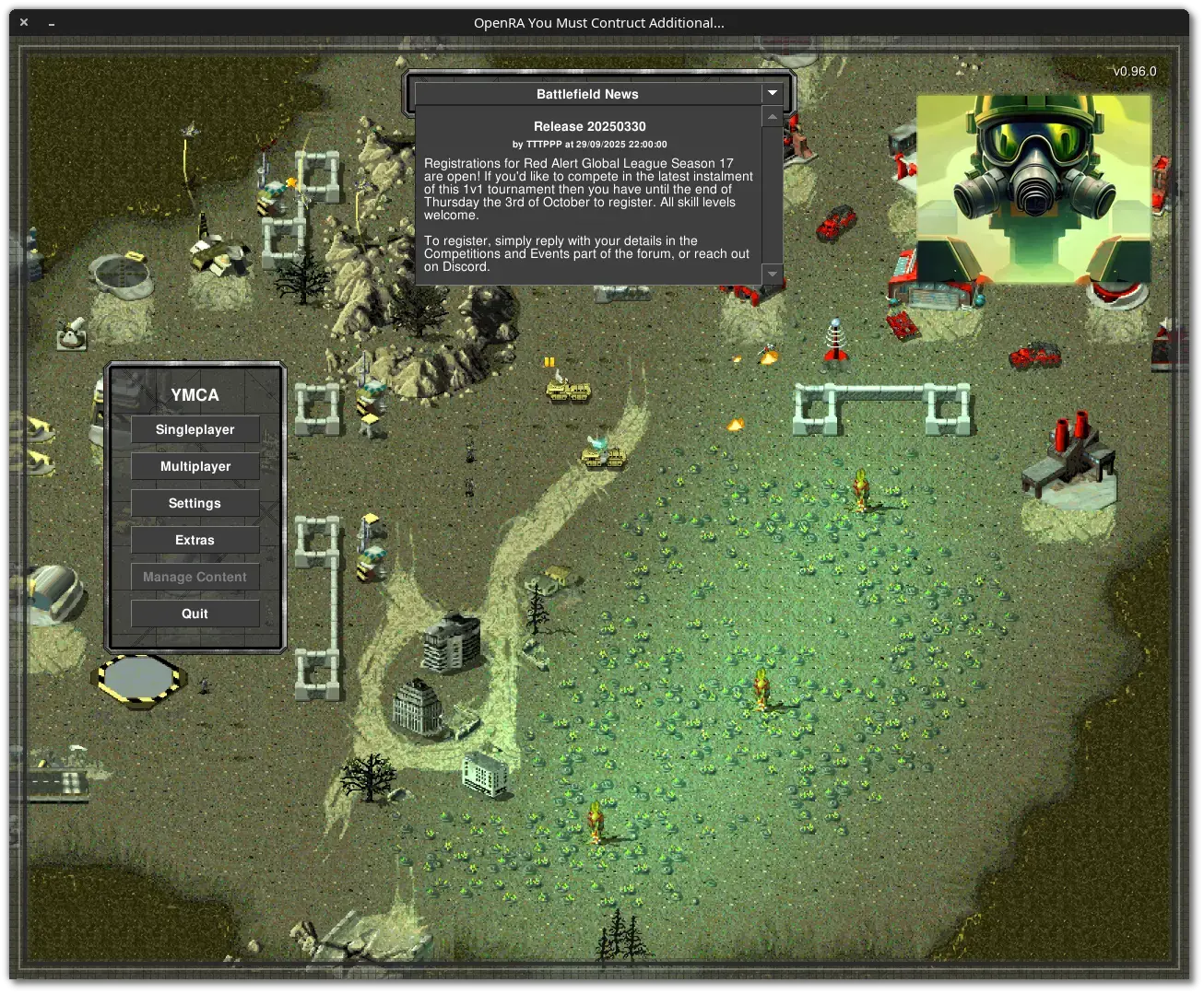You Must Contruct Additional (YMCA) est un jeu de stratégie temps réel (et un mod autonome d'OpenRA) libre et multiplateforme orienté vers les batailles de masse, inspiré de Age of Empires II, Supreme Commander, Rusted Warfare, et Combined Arms pour son gameplay. Les batailles de masse sont favorisées par la rapidité de constructions des bâtiments et unités. Les ressources demeurent nécessaires mais moins prégnantes (et ses cartes disposent de beaucoup de ressources). Il offre en plus des factions d'OpenRA celles dénommées "Chine" et "Scrin" (extra-terrestre) et des sous-factions. Un jeu à ne pas manquer si vous aimez les batailles de masse rapides.