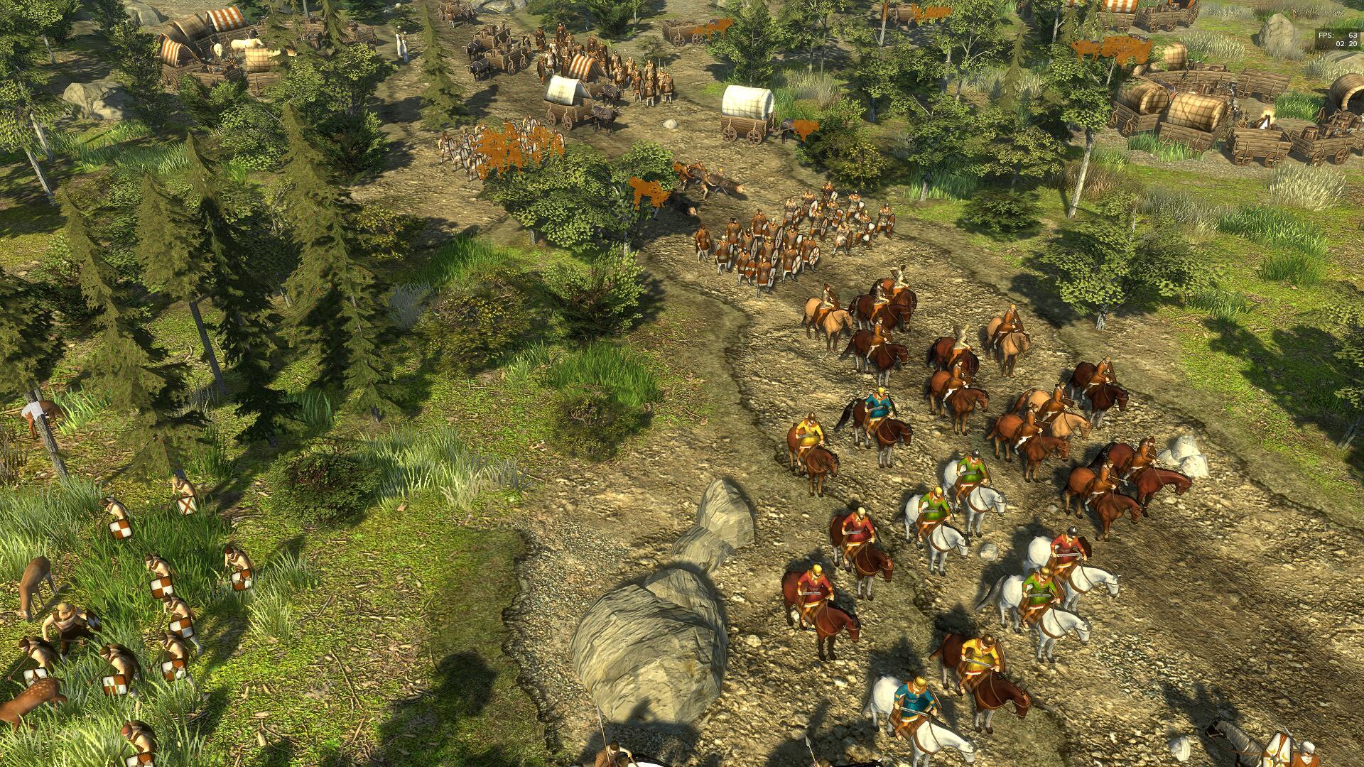 🕶️ A bird's-eye view of a game scene illustrating the new faction, the “Germans” at the beginning of their migration, with men on horseback in front, followed by men on foot and then wagons. On either side of this gathering are camps made up of wagons arranged in a circle around campfires.