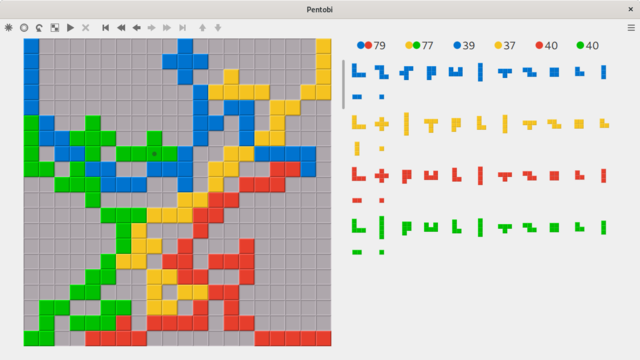 | Pentobi | Puzzle; Assembly; Blokus | 🕊️ Libre | A libre solo (IA) / multiplayer (up to 4 in hotseat) port of the Blokus board game whose objective is to place the maximum of its 21 pieces (polyomino) with different shapes on the board while blocking his opponent as much as possible. A piece can only be placed on an empty space and as long as it is adjacent to the edge of one of its own pieces. Part lasts about 8 min. The interface is extremely complete and neat, offering online help, a powerful AI with 9 levels, 7 game variations, player rating, a game analysis chart, saving / loading of games, etc. ... Excellent. | Un portage libre solo (IA) / multi (jusqu'à 4 en hotseat) du jeu de tablier Blokus dont l'objectif est de placer le maximum de ses 21 pièces (polyomino) de formes différentes sur le plateau en bloquant son adversaire autant que possible. Une pièce ne peut être placée que sur un espace vide et à condition de jouxter l'arête de l'une de ses propres pièces. Une partie dure environ 8 min. L'interface est extrêmement complète et soignée, offrant l'aide en ligne, une IA puissante avec 9 niveaux, 7 variantes de jeu, le rating des joueurs, un graphique d'analyse de la partie, l'enregistrement / la sauvegarde, etc ... Excellent. | 🐁️ Minor vers. | Latest: 💥️ 28.1 / Dev: 1653dde | 2025-11-22 | |