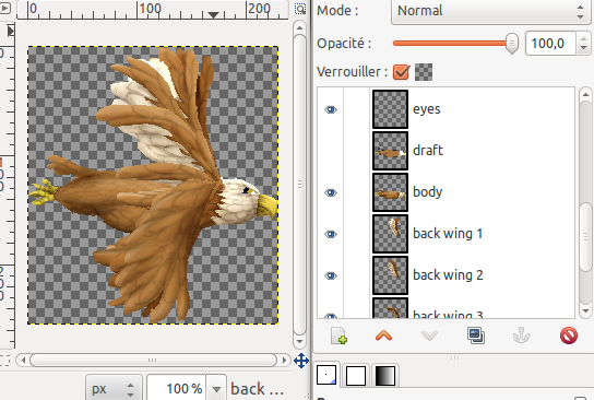 🕶️ A view of its UI with a sprite representing an eagle (on the left), cut into different layers (on the right).